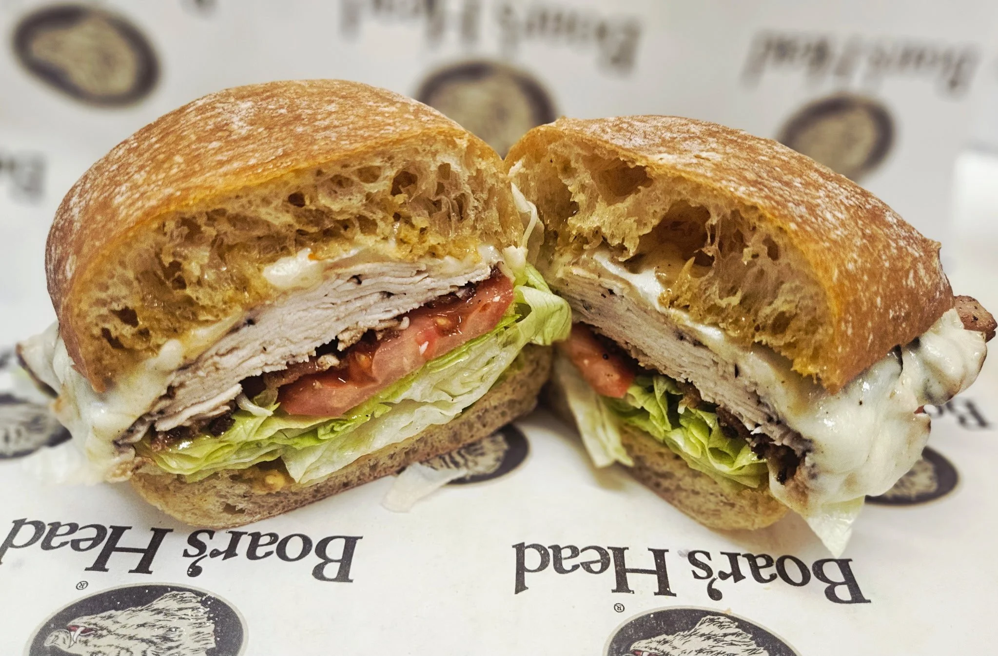 (Hot) Flame Grilled Chicken, Mozzarella, Lettuce, Tomato, Bacon, Spicy Garlic Parm Sauce on a grilled ciabatta roll.